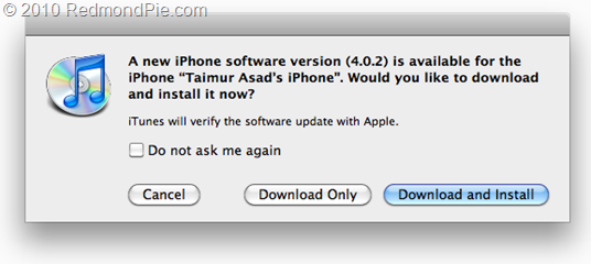 To update to iOS 4.0.2 for iPhone, and iOS 3.2.2 for iPad, all you need to do is to connect your iPhone/iPod touch/iPad with your computer via USB and start iTunes. You should now see a message as shown below. Simply click on “Download and Install” button to get on to the new firmware.